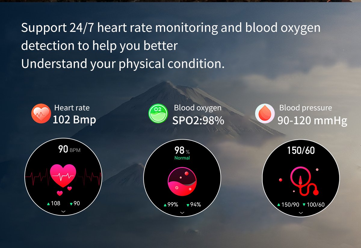 | Health Functions | Heart Rate, Blood Oxygen, Blood Pressure, Sleep Monitoring, Female Physiological alert, Stress Monitoring, Breathing Exercise |