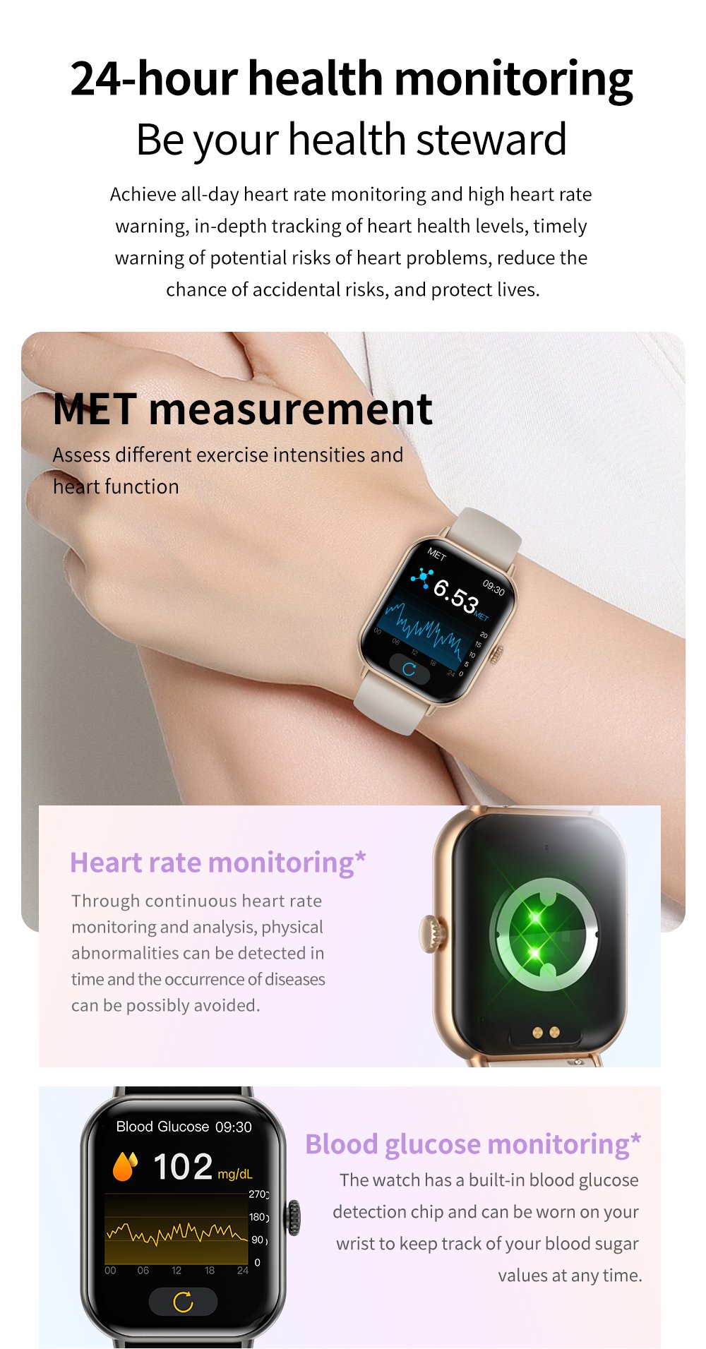 | Health Functions | Heart Rate, Blood Oxygen, Blood Pressure, Blood glucose, Body temperature, Sleep Monitoring, Female Physiological alert, Stress Monitoring, Breathing Exercise, Met |